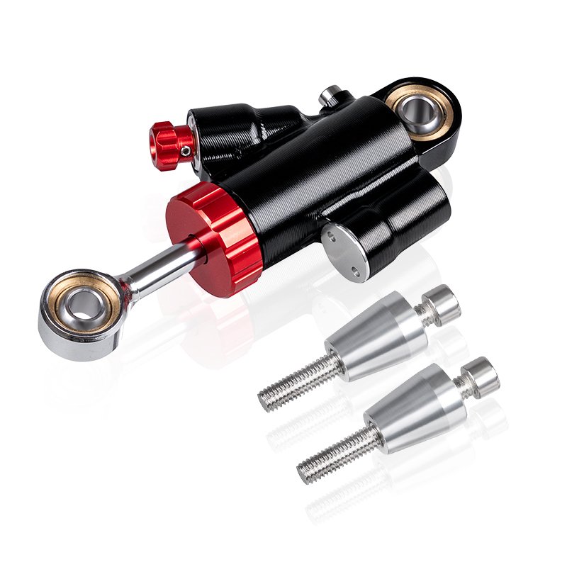Complete set of adjustable steering damper and stabilizer mounting kit.